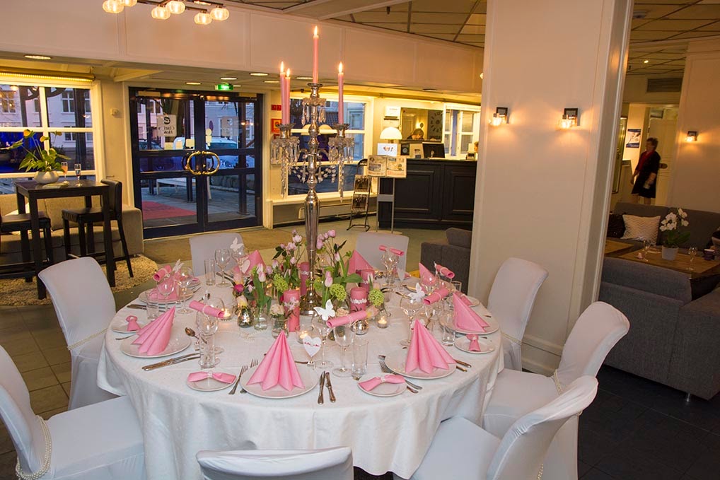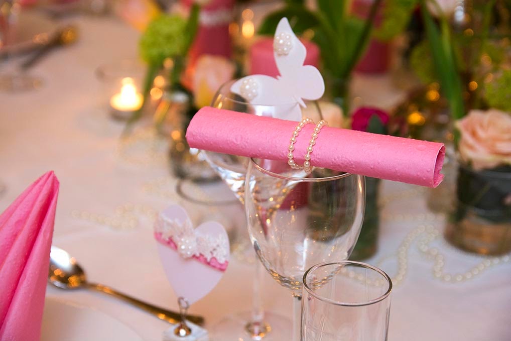 Rosa og romantisk bord med perler.