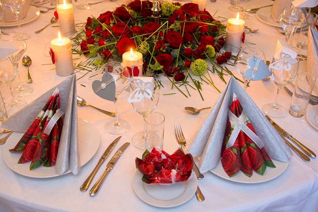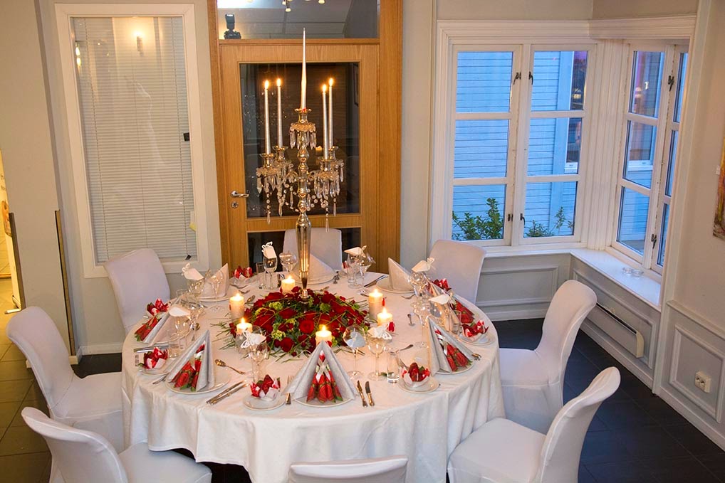 Sølv, rødt og hvitt og lekker rosekrans fra Slattene blomster.